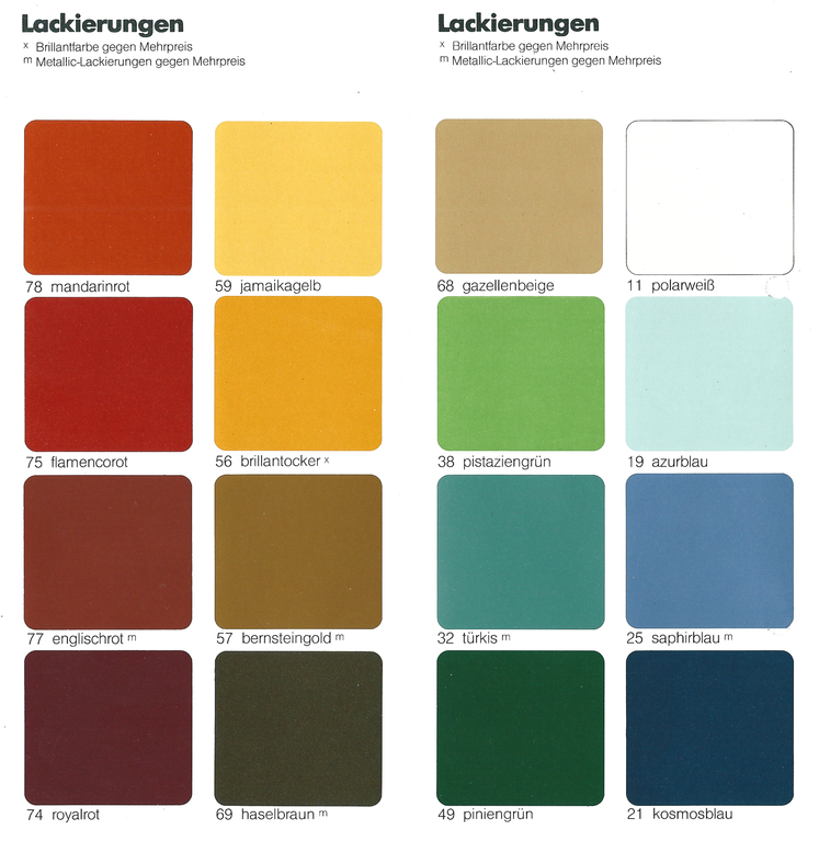 Anfänglich waren nur vier Farben lieferbar Chamonixweiß Alaskagrau Karibagrün Hawaiiblau die ab Dezember 1962 auch mit einem andersfarbigen Dach kombiniert werden konnten. Auch der Preis ist gemessen an der gebotene Qualitätsstufe absolut gut.